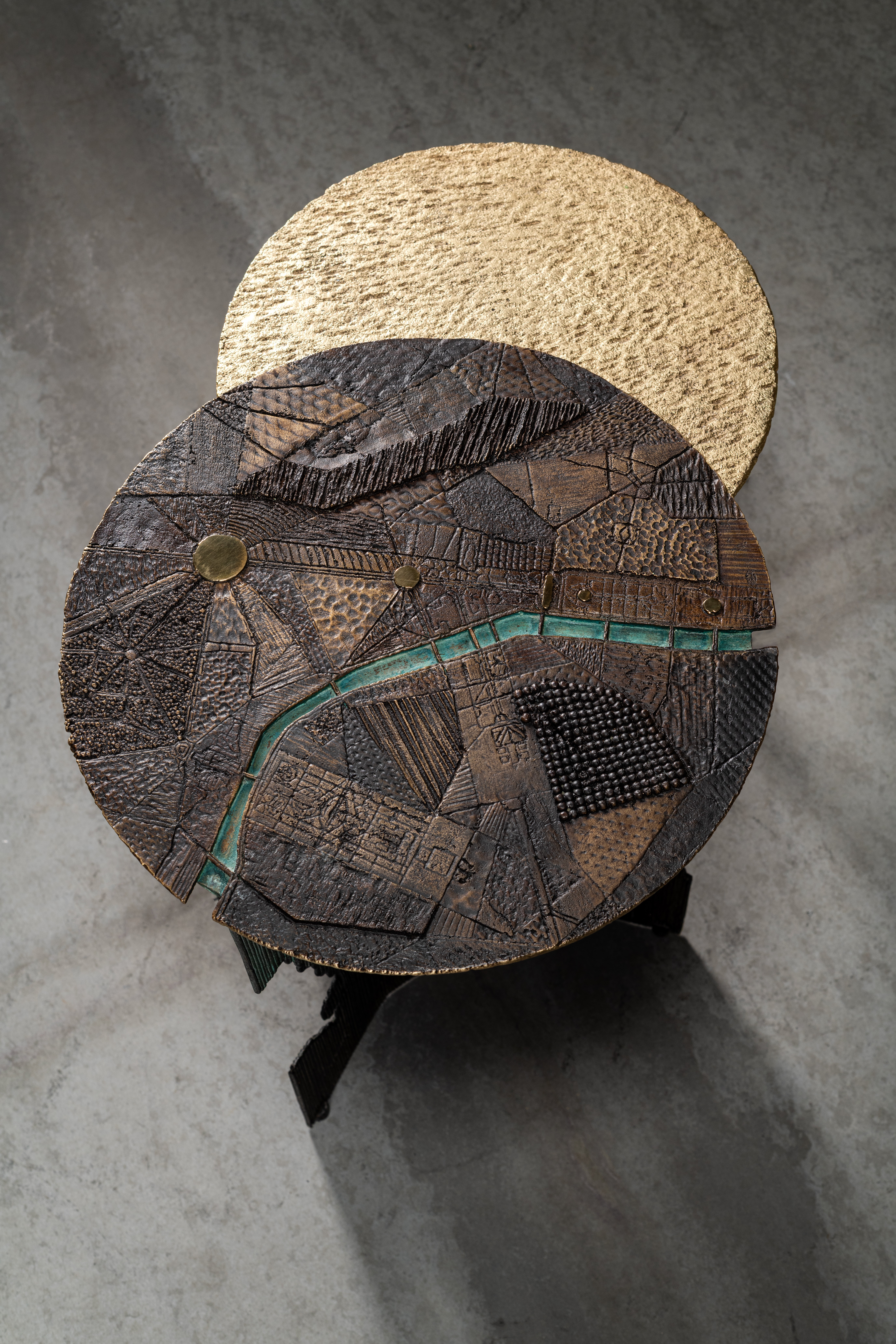 This low table is crafted from cast brass in two distinct sections, reflecting a topographic study of Paris . A green oxide strip separates the sections, symbolizing the Seine River running through the city.