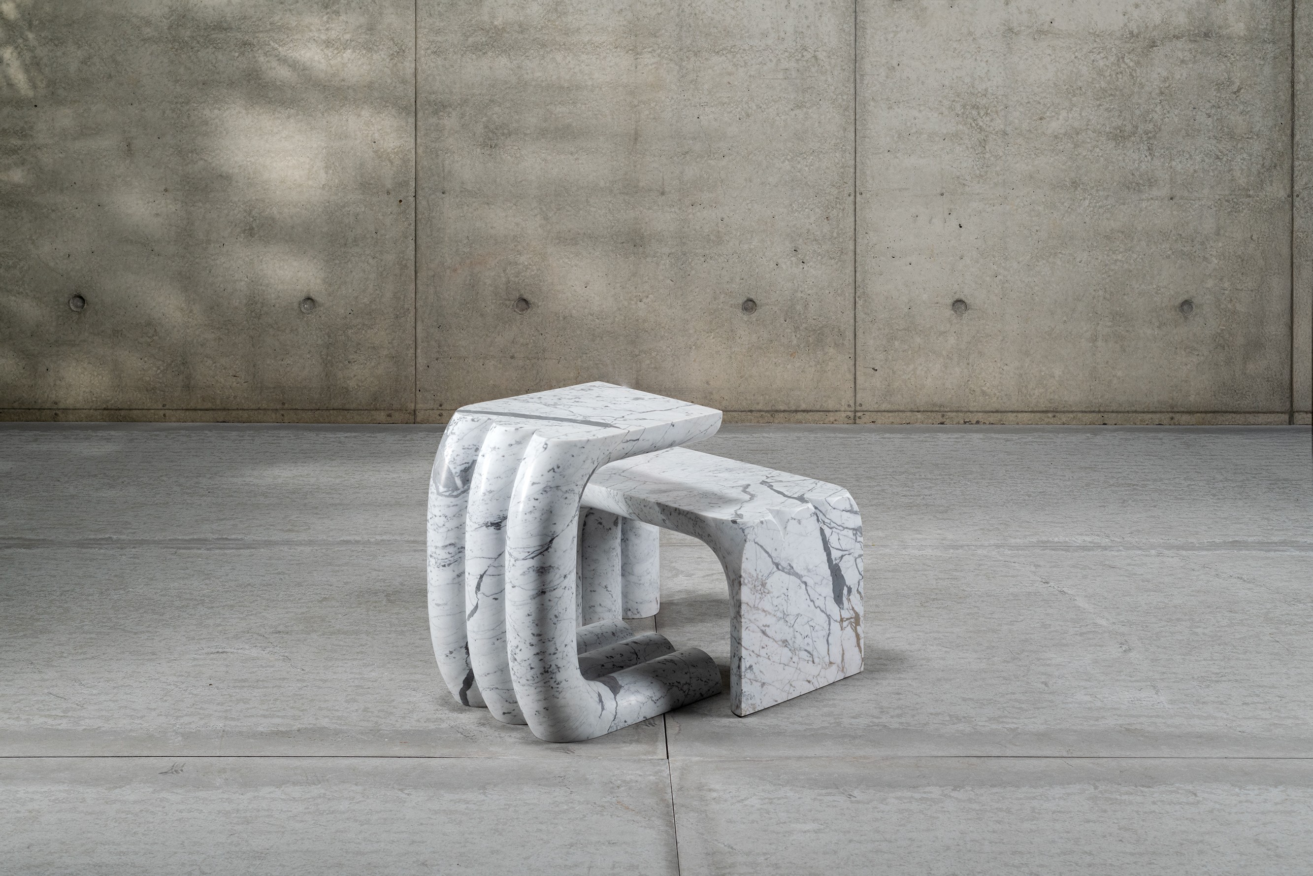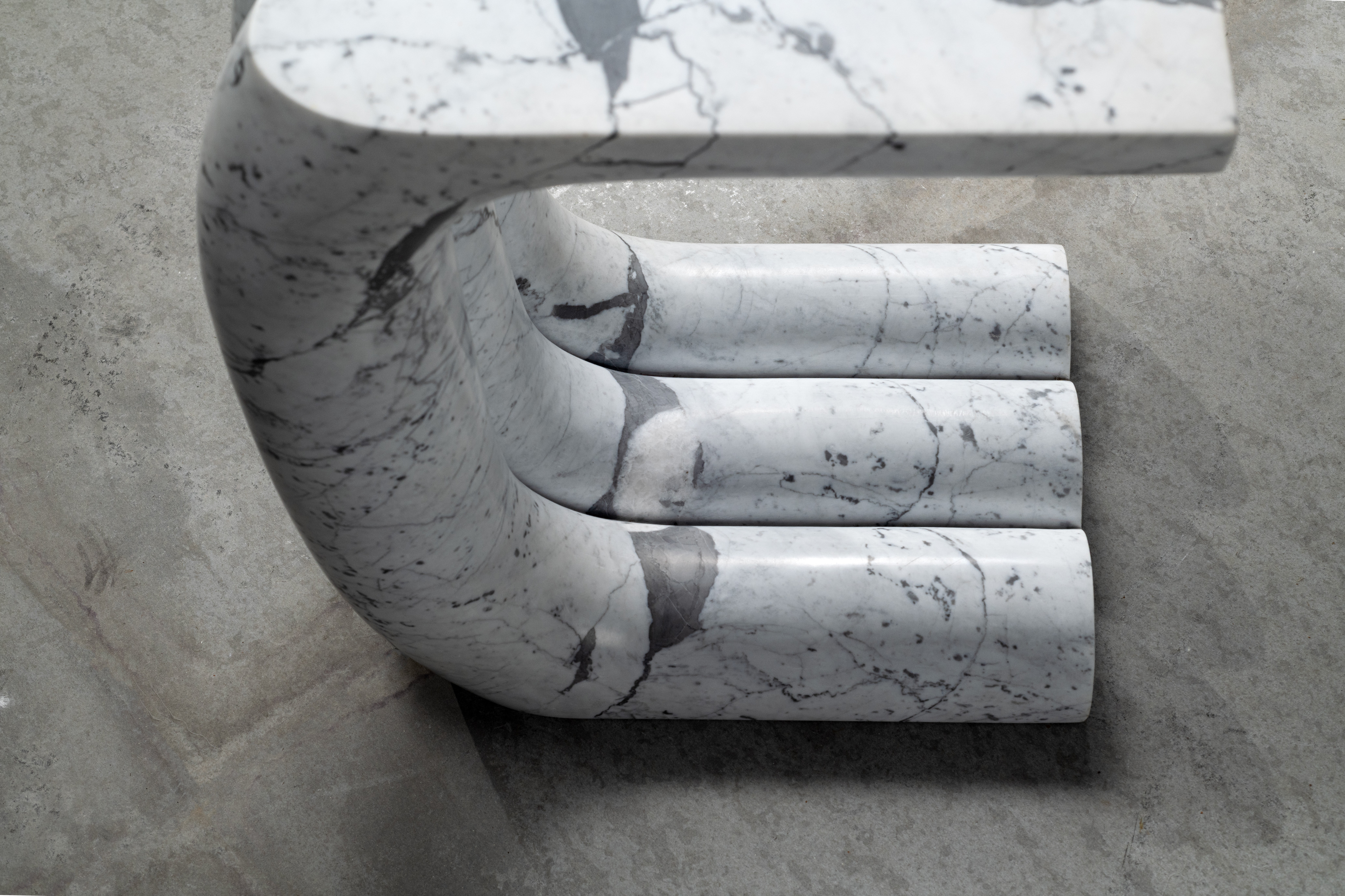 Carved from single blocks of stone, the Monolithic Collection celebrates the dialogue between geometry and material. Each piece, whether bench, console, or side table emerges from the same architectural gesture: a continuous curve that bends and folds upon itself, defining both structure and void.